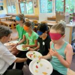 In weiteren Programmpunkten wurden Stöcke geschnitzt und Stockbrot gegrillt. Die Kinder bereiteten in Eigenregie Beiträge für den bunten Abend vor und präsentierten diese in einem umfangreichen Programm – von Tanzeinlagen über Theaterstücke bis zum Mohnbachtal-Quiz zeigten die FünftklässlerInnen unterhaltsam ihre Fähigkeiten. Die Hühner und Ziegen des Streichelzoos wurden nach Strich und Faden verwöhnt. Außerdem gab es eine lange Wanderung durch das Mohnbachtal und eine kürzere Nachtwanderung mit Fackeln.